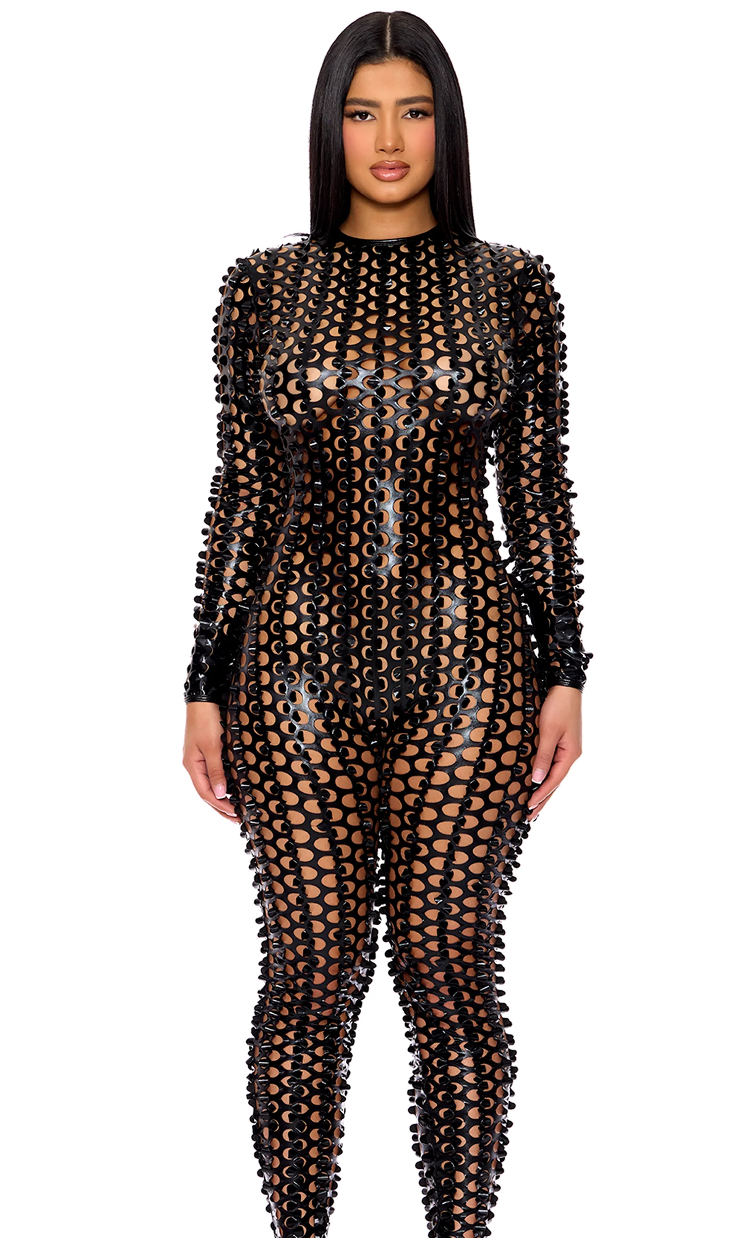 This sleek jumpsuit features stylish cutout lasercut holes and a fashionable mockneck design. The convenient zip closure in back makes it easy to wear. The stretchy fabric hugs your silhouette for a trendy, flattering fit. This jumper is perfect for various occasions.